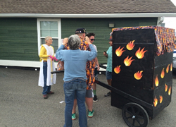 After the burros with their 'miners' take off on their marathon race, the infamous Fairplay Outhouse Race follows. The RMRH entry did not win the coveted "Golden Toilet Seat", but we did get voted the "People's Choice Award" for our "Pearly Gates" entry.